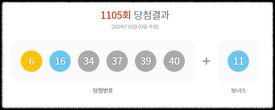 2024년 2월 3일, 제1105회 동행복권 로또 추첨이 있었습니다. 이번 추첨에서는 '6, 16, 34, 37, 39, 40'이라는 숫자가 1등 당첨 번호로 결정되었고, 2등 보너스 번호는 '11'이었습니다. 이번 회차에서는 총 15명의 행운의 주인공이 1등에 당첨되어 각각 약 18억 3485만 원의 당첨금을 받게 되었습니다.