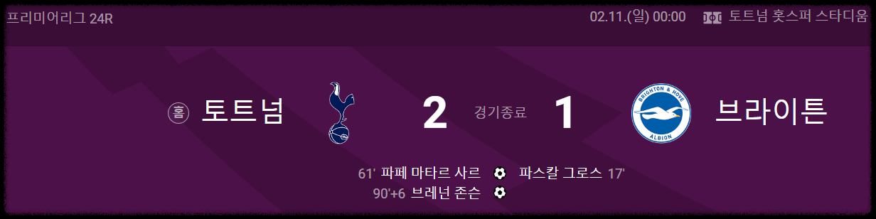토트넘은 전반 17분에 브라이턴에게 선제골을 허용하며 불리한 출발을 보였습니다. 하지만 후반 16분에 파페 사러가 동점골을 기록하며 경기의 균형을 맞췄습니다. 이후 손흥민은 후반 17분에 교체 투입되어 경기의 흐름을 바꾸는 데 중요한 역할을 했습니다.