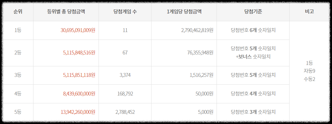 1등 당첨자 11명 중 자동선택은 9명, 수동선택은 2명으로 확인되었습니다. 1등 당첨지역은 서울 4명, 경기인천 4명, 그리고 전남 경북 제주 각 1명씩 당첨되었습니다.